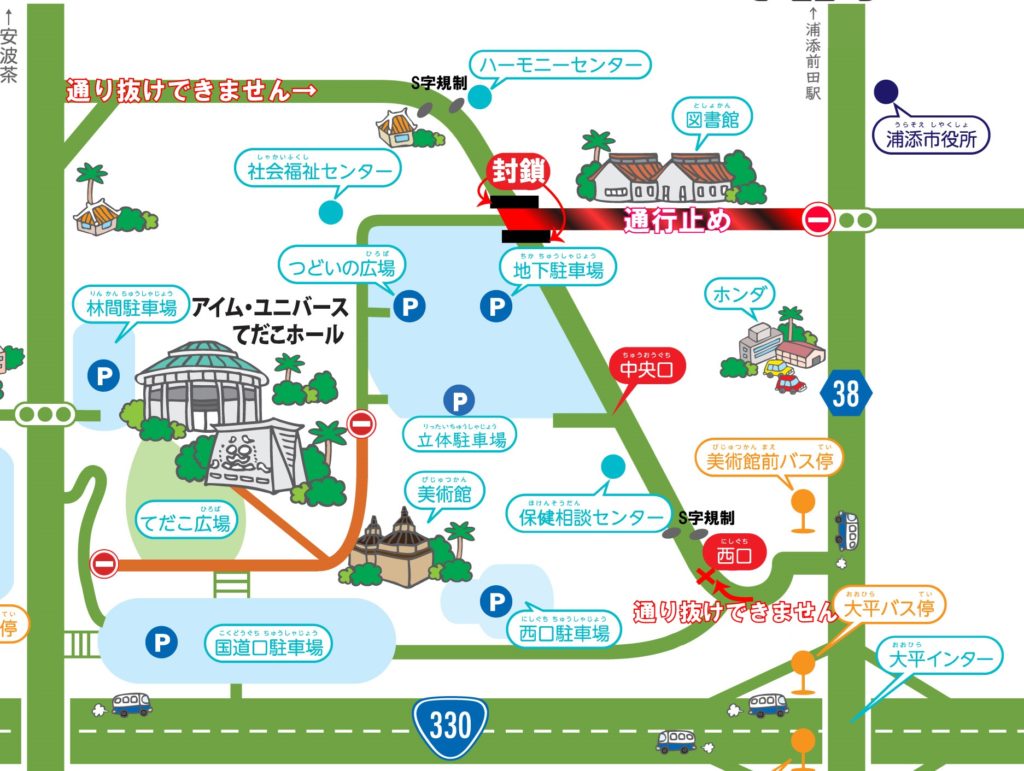 通行止め区間あかひらステーションビル前からてだこホール向け車道